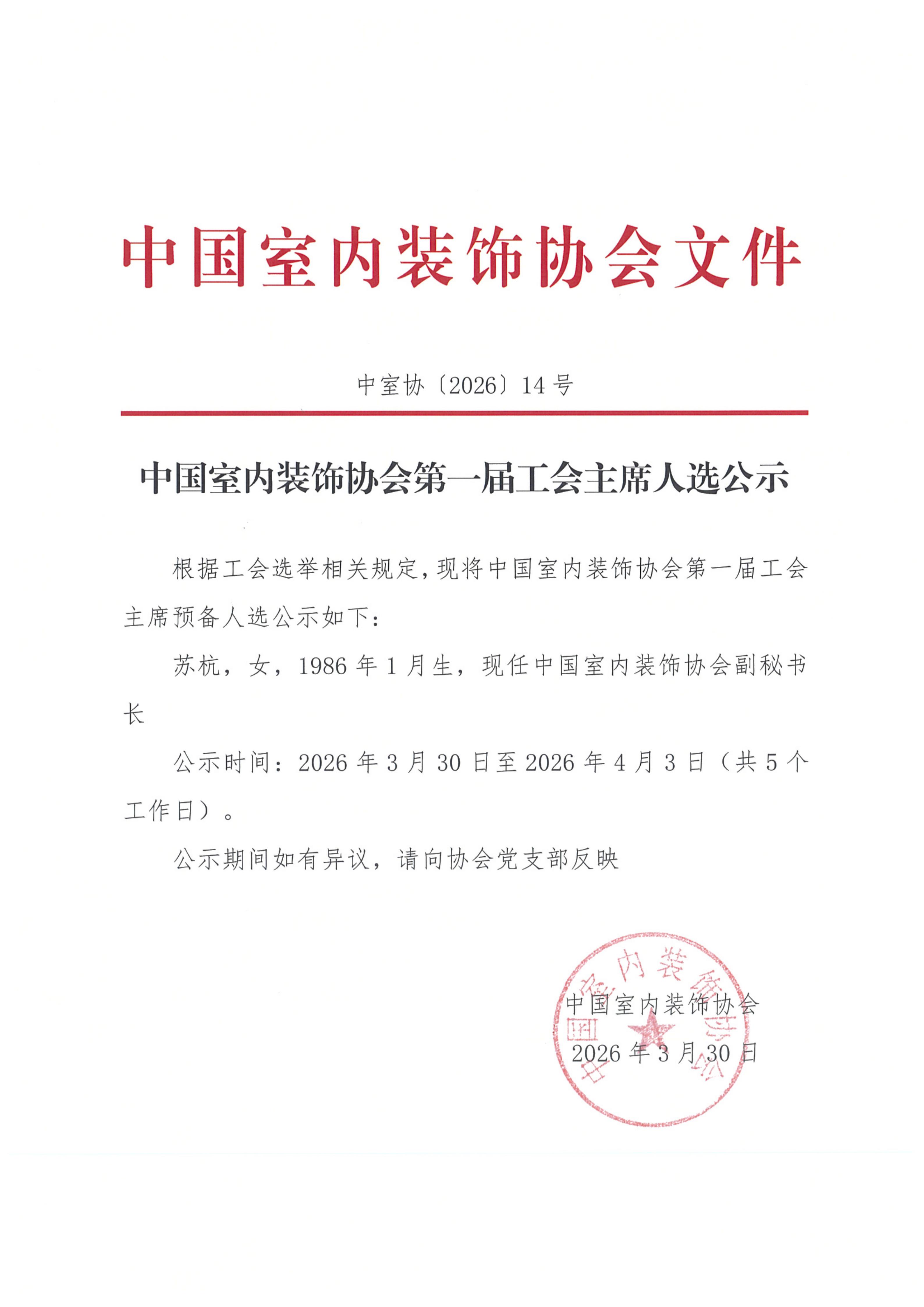 中国室内装饰协会第一届工会主席人选公示